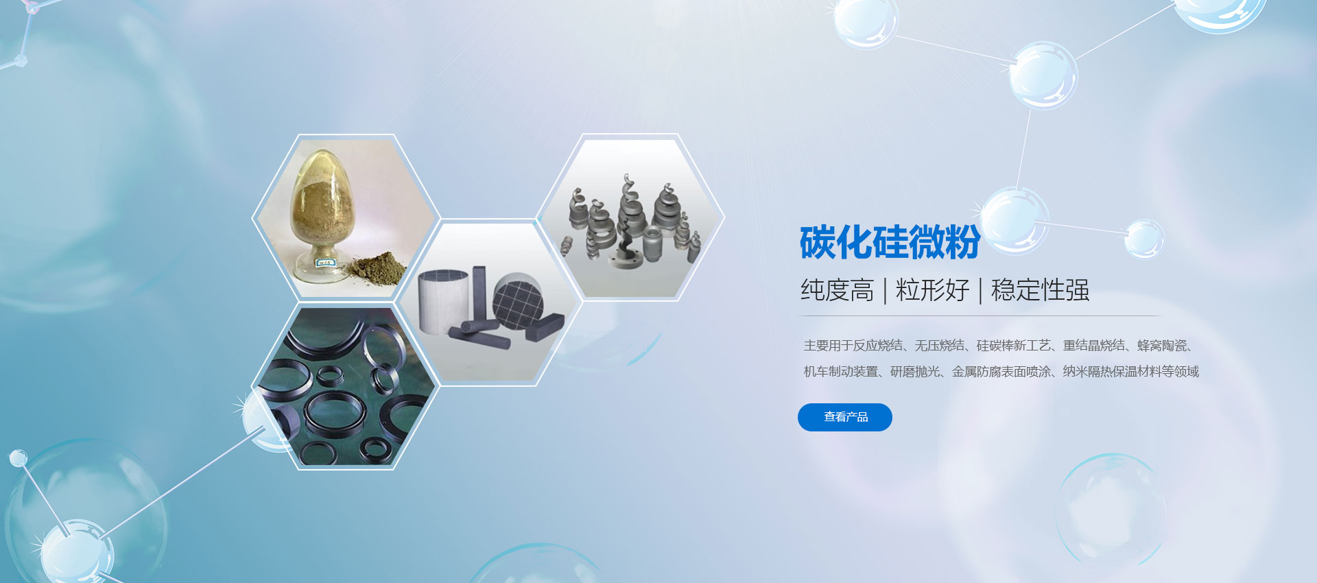 濰坊凱華碳化硅微粉有限公司成立于2002年,國家高新技術企業,公司占地40畝,標準廠房19000平方,辦公樓、研發2000平方,年生產能力3萬噸。一直從事陶瓷級微粉的生產銷售,所生產的微粉具有純度高、粒形好、穩定性強等特點,主要用于反應燒結、無壓燒結、硅碳棒新工藝、汽車尾氣處理(DPF)、納米隔熱保溫、機車制動、防腐涂料、研磨拋光、橡膠樹脂等領域。標準產品有:F240、F1200、W40、W28、W20、W14、W10、W7、W5、W3.5、W2.5、W2、W1.5、W1、W0.5、D3E、5S、100F及整形高密度系列綠碳化硅微粉,廣泛應用于燒結、防腐、研磨拋光、涂腐等廣大領域。